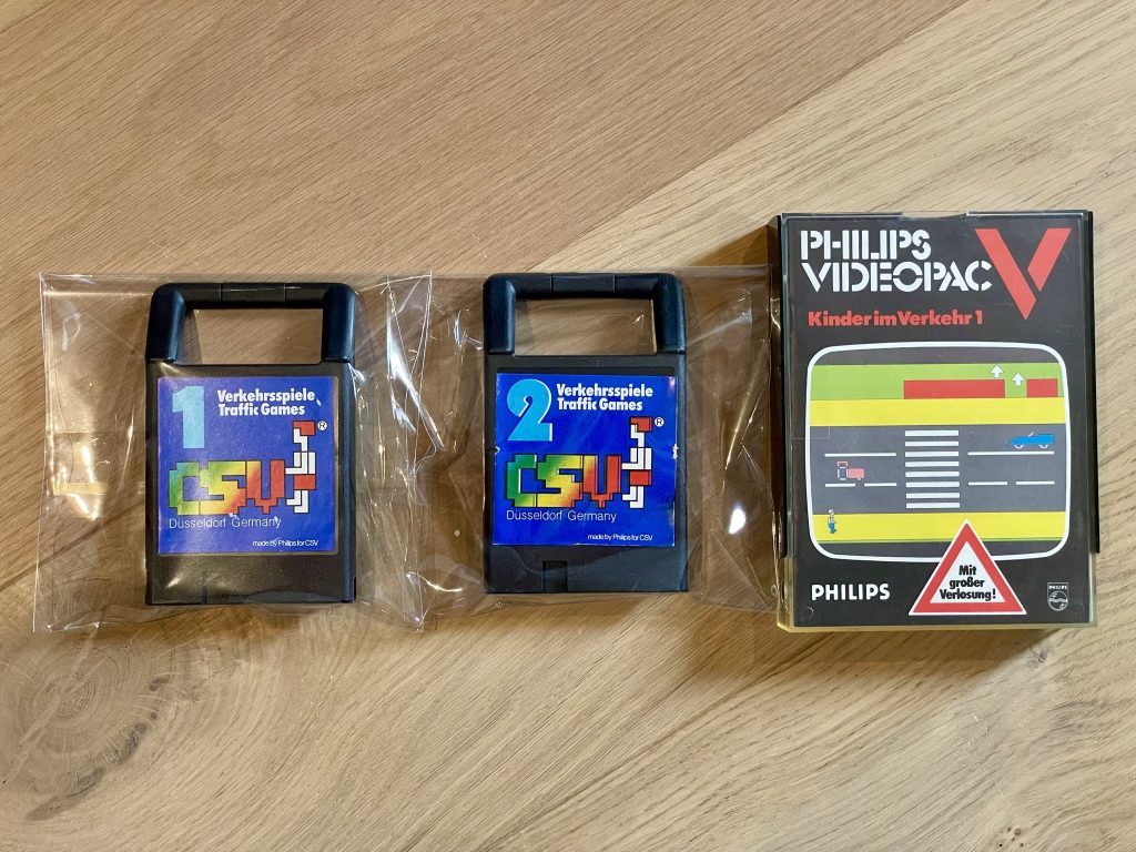 In 1982, Philips introduced a special version of the Videopac in cooperation with a West German advertising agency from Düsseldorp; CSV. This CSV Video-Traffic Games Edition of the G7000 was given to approximately, 3600 primary schools in a small region of West Germany. The package consisted of a G7000 and two specially made games; Verkehrsspiele 1 and Verkehrsspiele 2. These games were not games in the traditional form, but edutainment titles to teach children the basics of how to behave on the street.