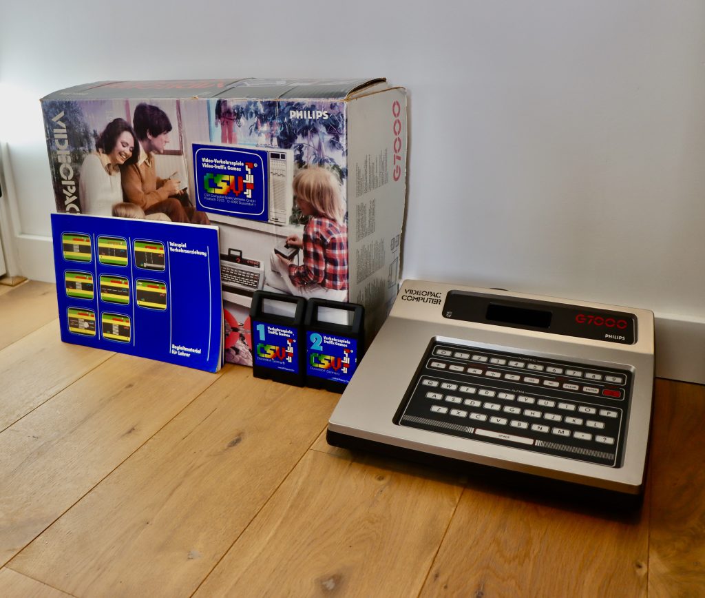 The G7000 in this Traffic Games edition was a standard version of the console with no special reference. The package, however, came with a special “Video-Traffic Games” sticker affixed to the TV screen on the box and the two forementioned games. There was also some extra guidance material for teachers in the box. Strangely, this guidance material doesn’t mention the Videopac, but refers to ‘Telespiel’; which were cheap Philips pong consoles in the late 70s.
