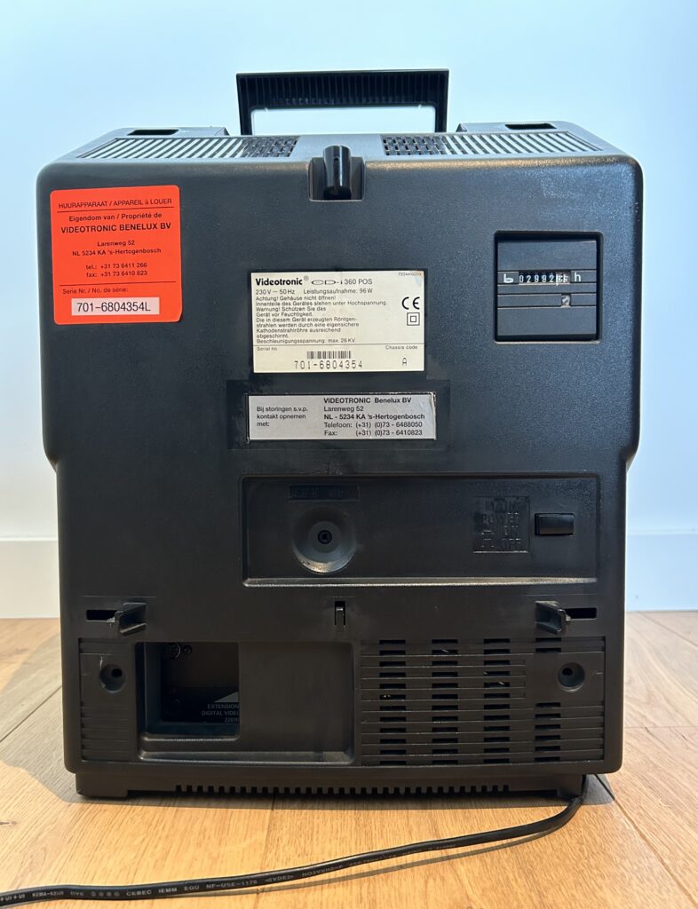 The TV was primarily used in DIY stores (bouwmarkten) in the Netherlands. They could be rented from Videotronic and had to be returned afterwards. This is also reflected on the sticker on the box that says ‘please keep the box for return shipments’ and a sticker on the back of the TV that says: ‘Rent-device, property of Videotronic Benelux B.V.’. Since almost all M360 POS TVs were returned to Videotronic, the TV is extremely rare to find.