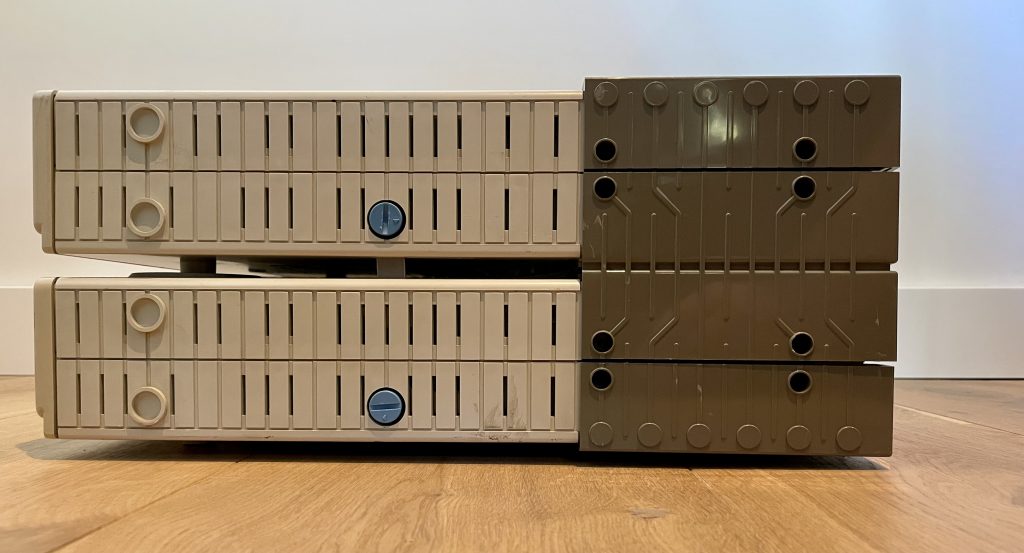 The CDI 180 system was modular and consisted of three layers of hardware connected on the side of the console (see pictures). Power was also distributed from between the layers (on the back). Only the CD drive (CDI 180) and the MultiMedia Controller (CDI 181) were needed to make it operational. The CDI 182 module (not on picture) could be added for additional capabilities, featuring two floppy disk drives, SCSI and parallel ports and an additional 1 MB of RAM. The system could not be extended with a Digital Video cartridge.