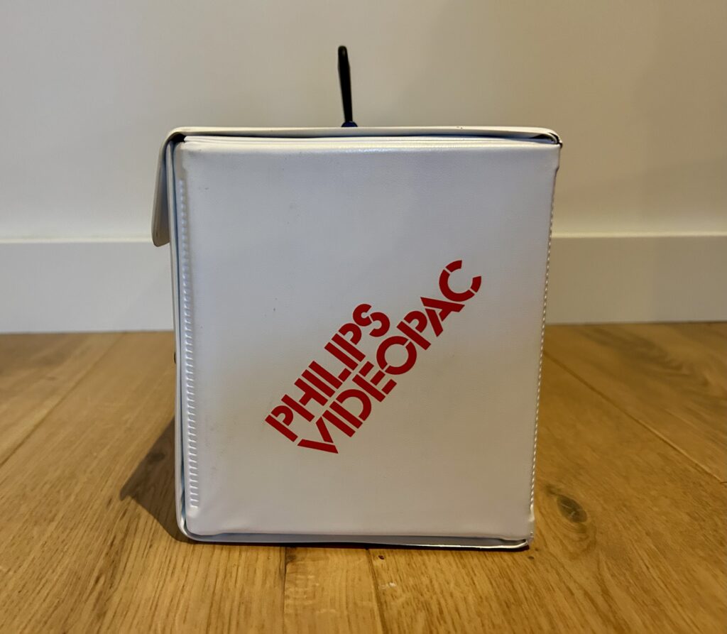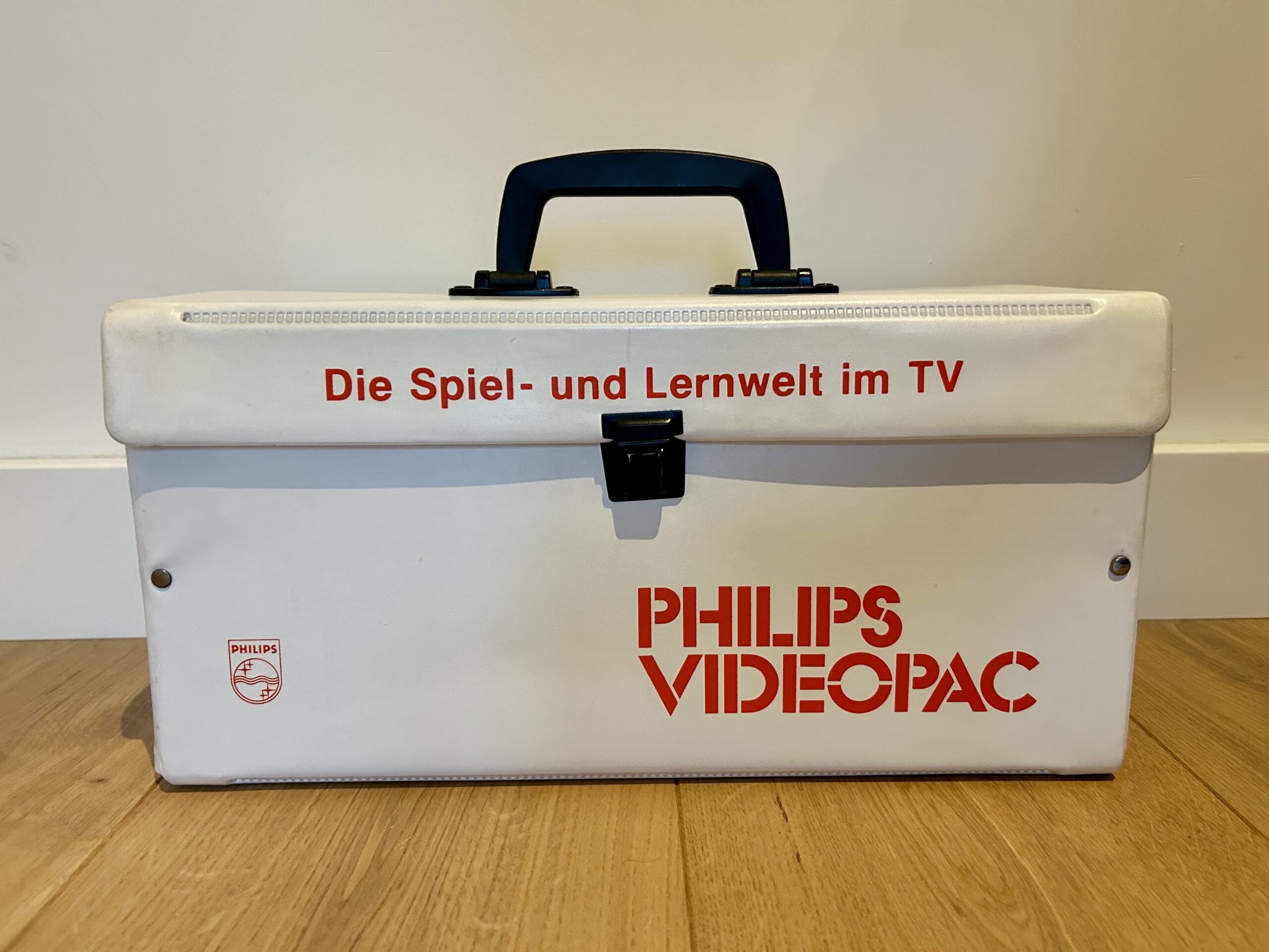 This carrying case is very rare; it was only sold for a very limited time, and probably only in Austria. An advertisement for it appeared in a 1985 issue of “G7000 Club News,” the Austrian Videopac club magazine. The ad urges the reader to go to “your specialist dealer,” which suggests that the Collecting Box was sold in stores. The legend across the lid of the box translates from German to English, “The play – and learning world on the TV.”