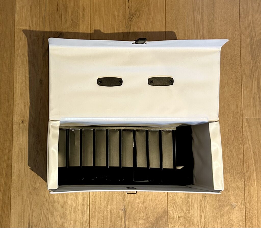 Austrian collecting box / carrying case for Videopac games that is similar to the Cassette Box, but made of hard plastic rather than cardboard. It contains a black tray similar to the Cassette Box’s. This tray is also made of plastic, but of lesser quality than the outside of the carrying case.